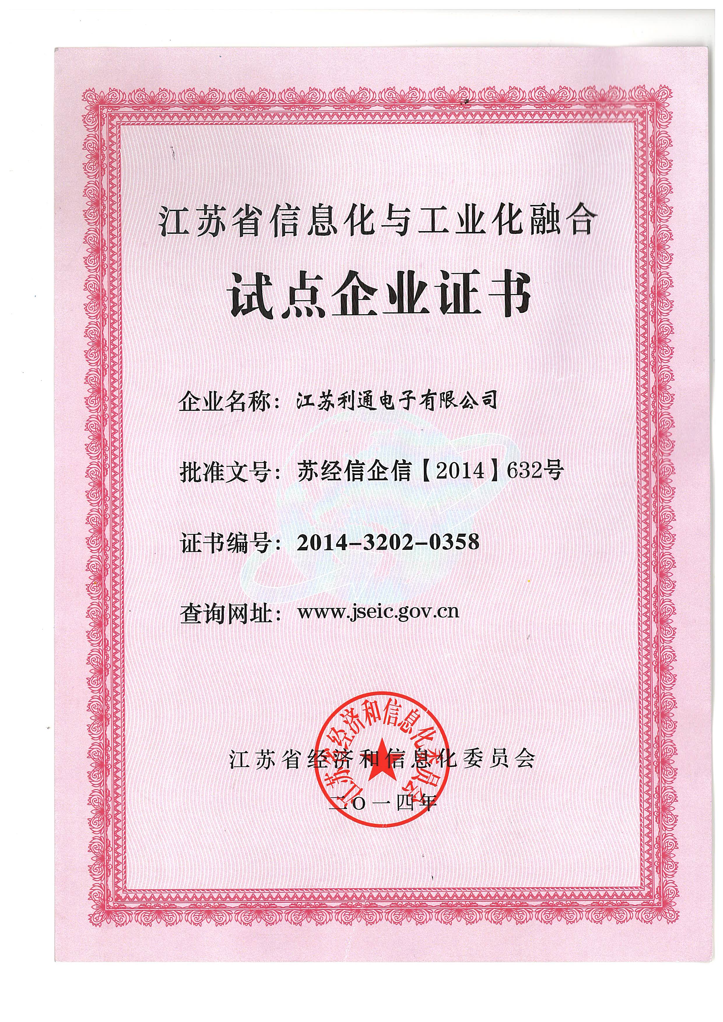 江蘇省信息化與工業(yè)化融合試點(diǎn)企業(yè)證書