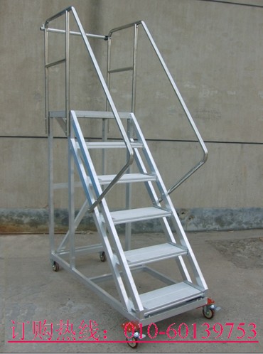 處堆取物品等動作。另外,登高車配有腳輪,可供使用者推拉轉向移動,方便快捷。其中有前腳輪上配備有輪剎,剎住后,登高車固定不可移動,使用者可放心的登高操作。