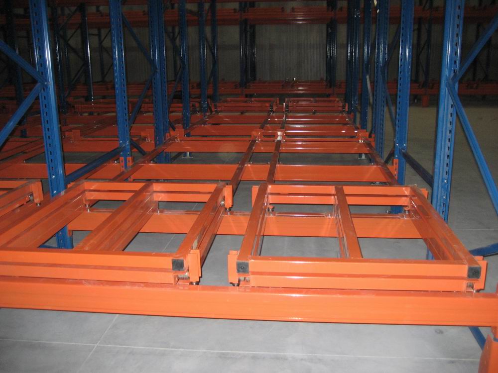 推入式貨架又稱后推式貨架,是在前后梁間以多層臺(tái)車重疊相接,從外側(cè)將疊棧貨物置于臺(tái)車推入,后儲(chǔ)存之貨品會(huì)將原先貨品推往里面。充分利用空間,空間利用率比普通貨架提高3倍。地面滑軌穩(wěn)定流場(chǎng),并且有多種安裝方式。搖柄或者拖拉把手,特殊應(yīng)用可以選擇電動(dòng)。分為人力推動(dòng)(Manual Mobile Rack)、搖把驅(qū)動(dòng)式(Crank-type Mobile Rack)、電動(dòng)式(Electric Mobile Rack)。